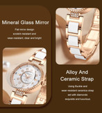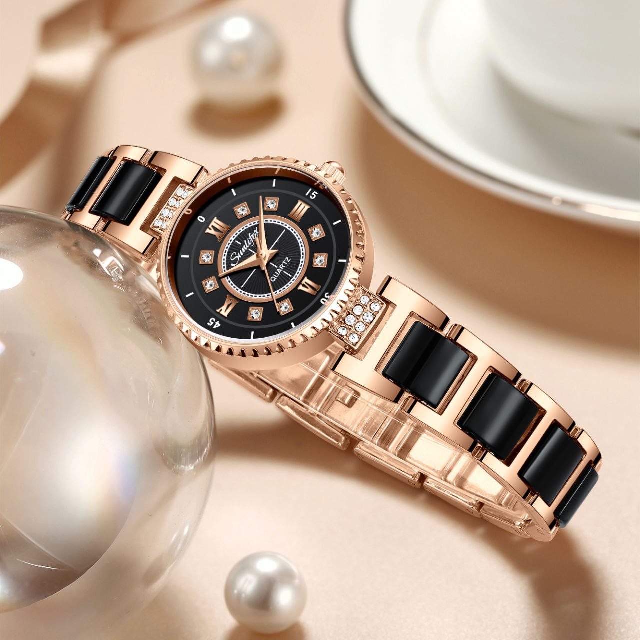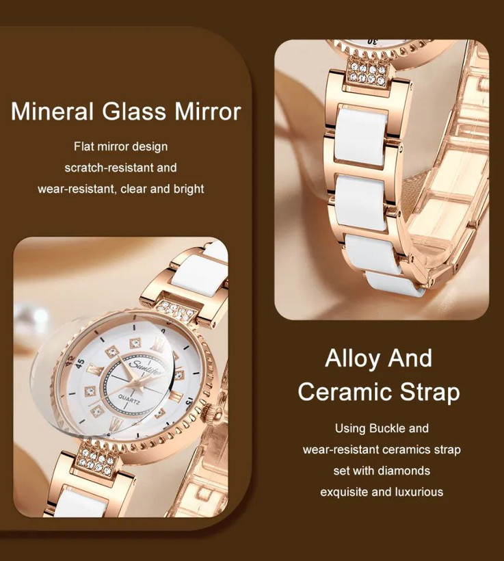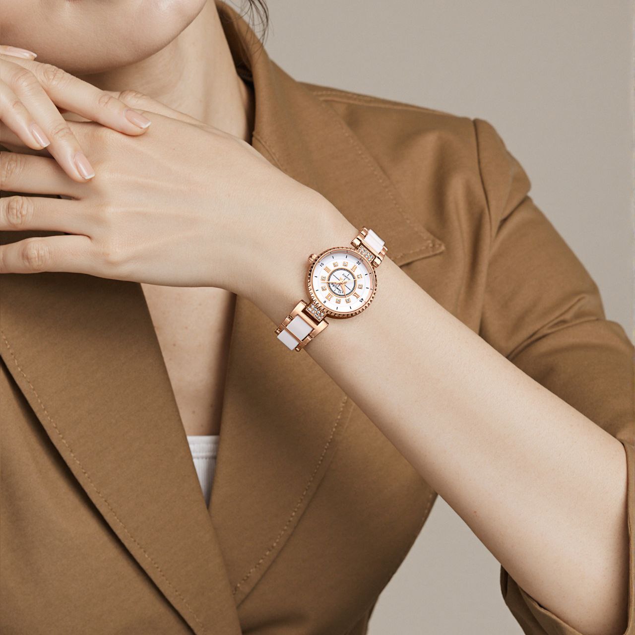 ترکیبی از زیبایی ودوام،طراحی ظریف،ظاهری درخشان وکیفیتی ماندگار...بدنه وبندسرامیکی ورنگ ثابت،موتور کوارتز ،ضداب درحد دست شستن،ظاهر شیک وحس لوکس روی دستس